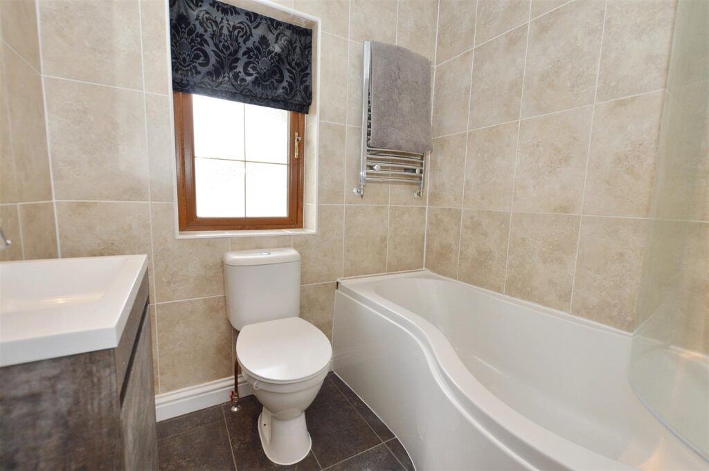 Panelled bath with mixer shower and screen, fully tiled walls, close coupled w.c., vanity wash basin with cupboards beneath, chrome heated towel rail.