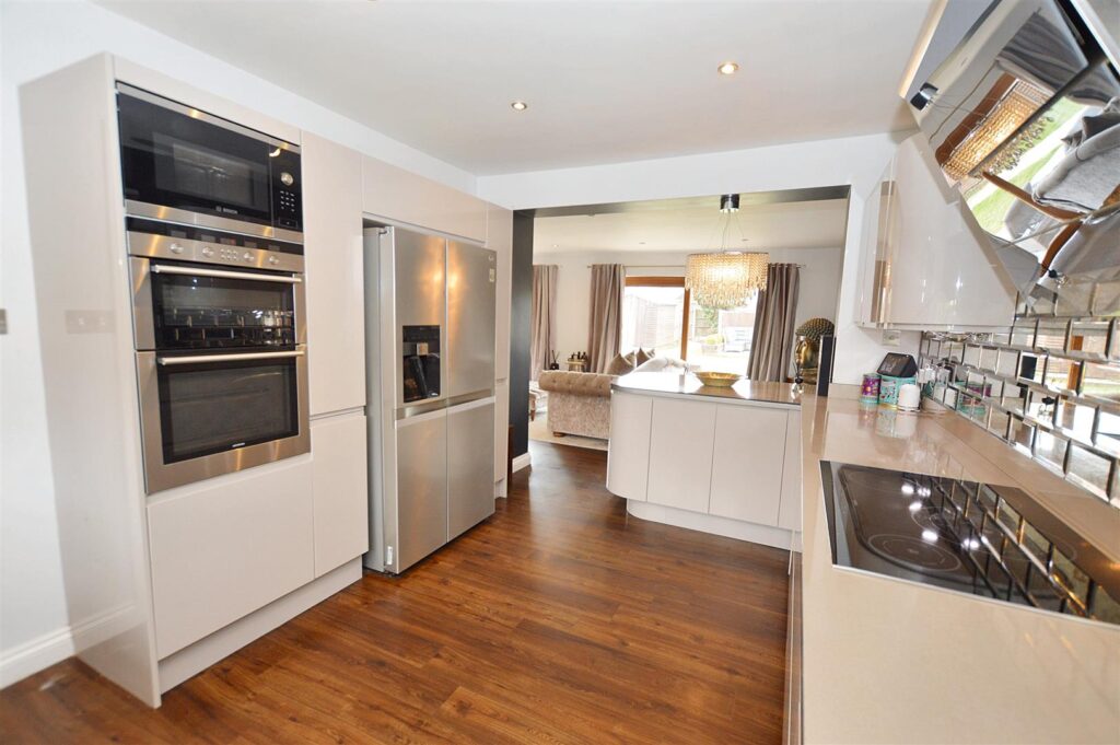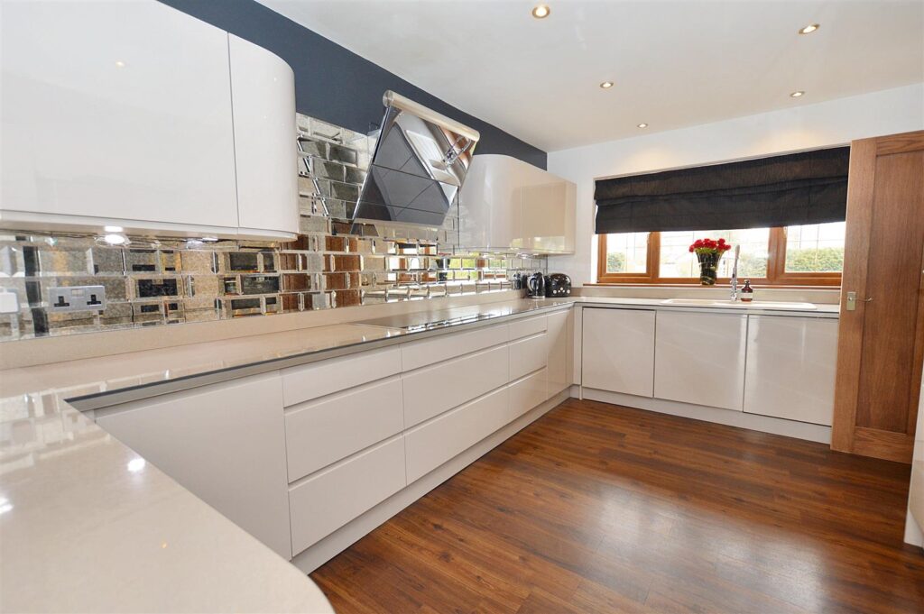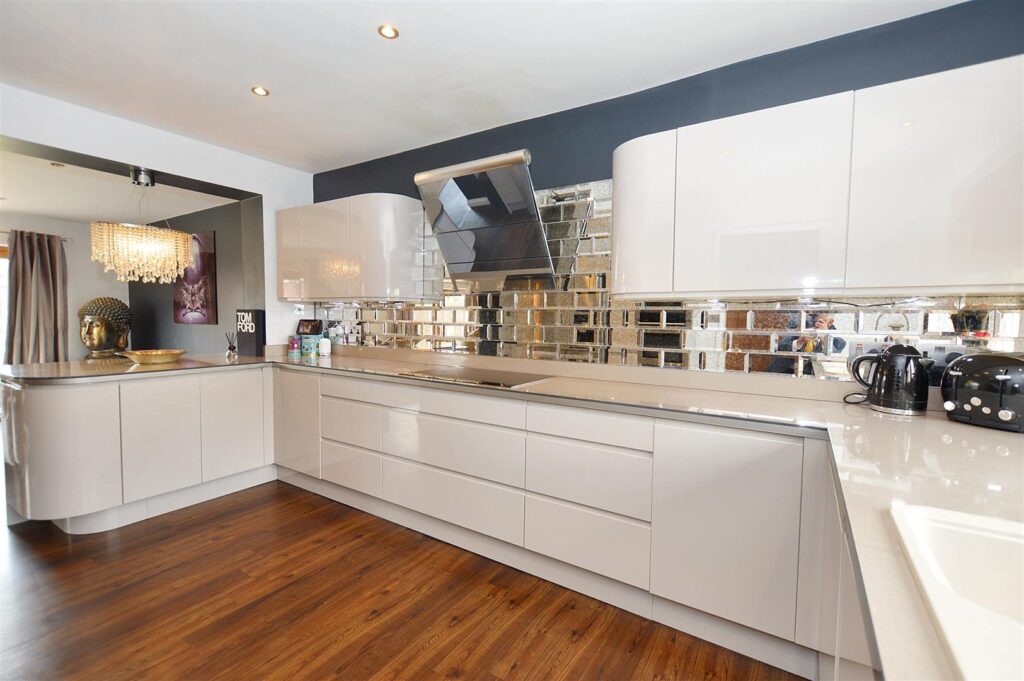 Beautifully fitted with a contemporary range of high gloss base and wall storage cabinets with solid work surfaces with matching upstands and mirror tiling. Inset double oven with combination microwave above, inset sink unit beneath window to front aspect, integrated dishwasher, inset electric induction hob with contemporary filter hood above, recessed ceiling spotlights and work top lighting, continuations of wood laminate flooring.