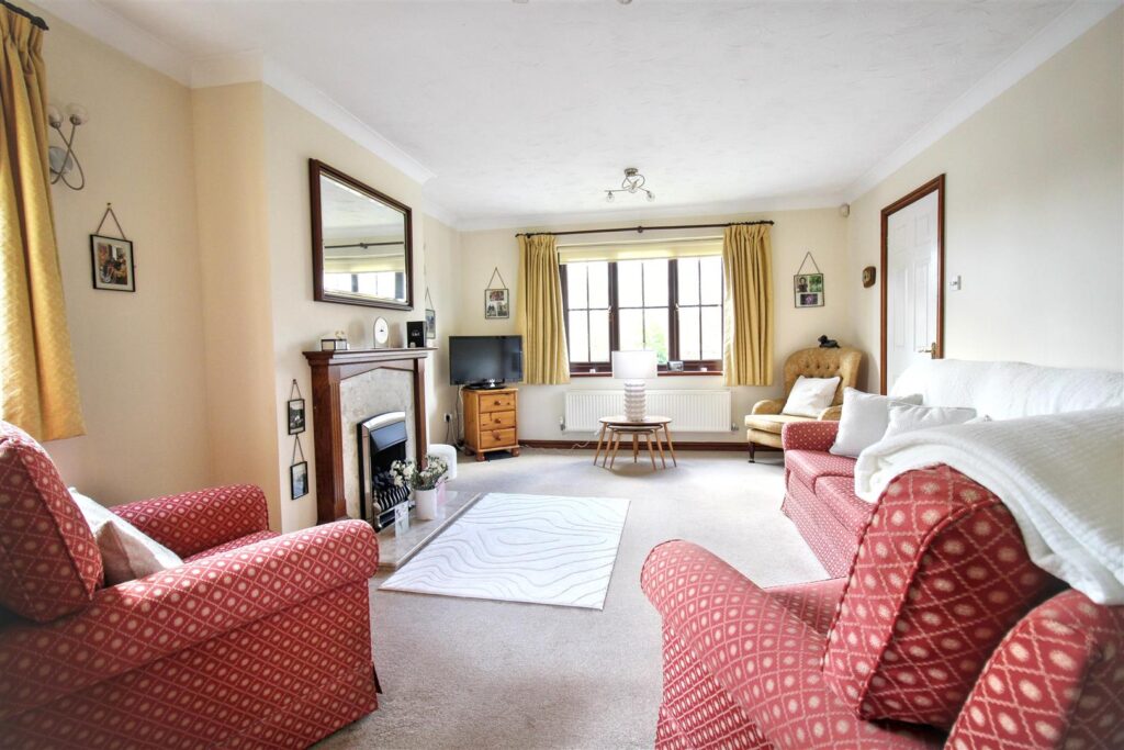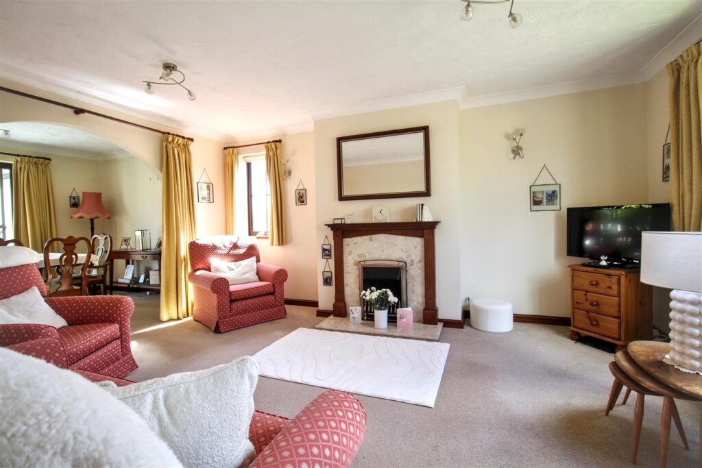 A dual aspect room with double glazed window to side and front aspect, fireplace with ceramic hearth and wooden mantle over, radiator, carpet, archway leading to dining room.