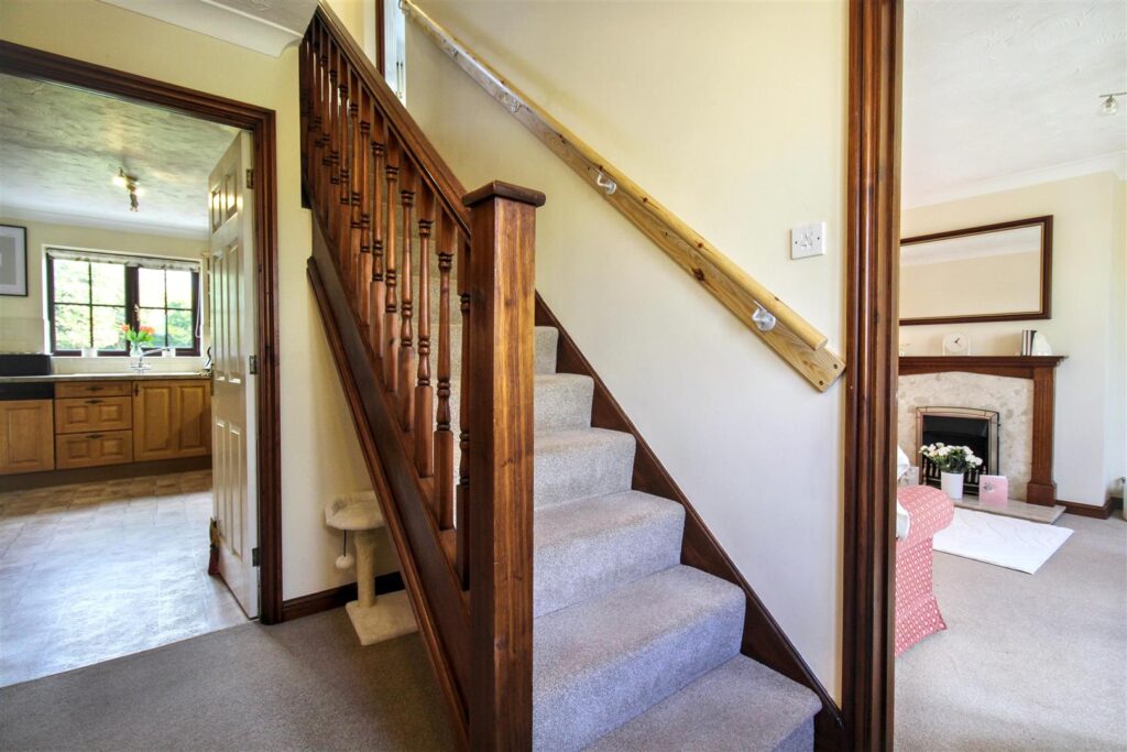 Timber door to front entrance with obscured glass panels, built in storage cupboard, carpet, radiator, stairs to first floor.