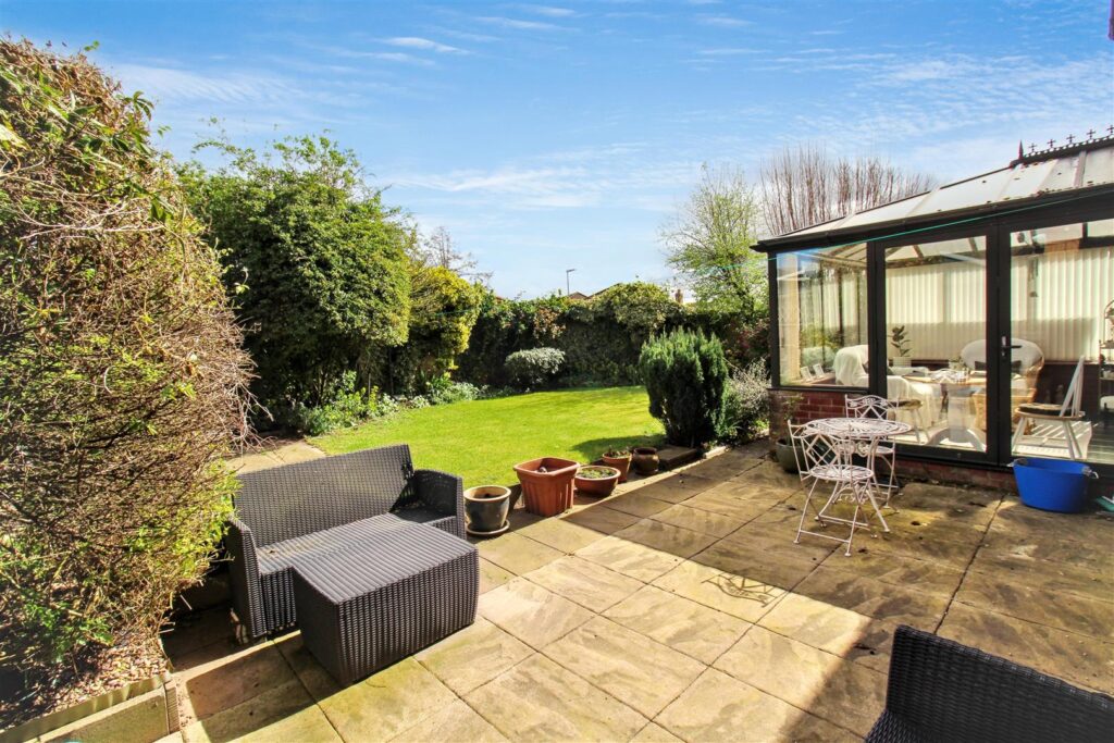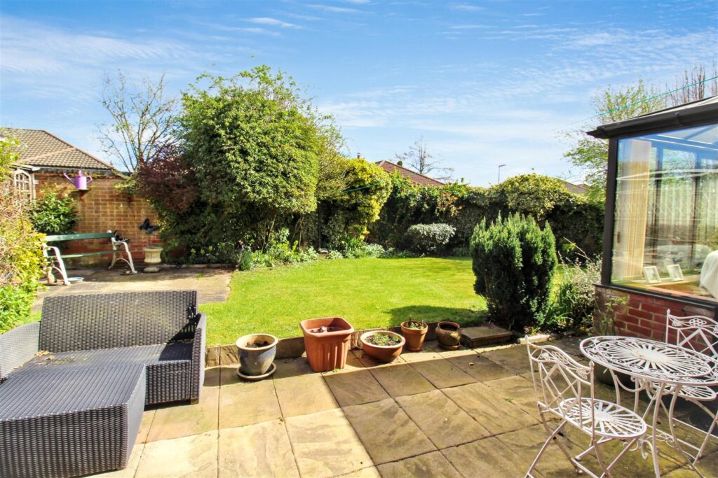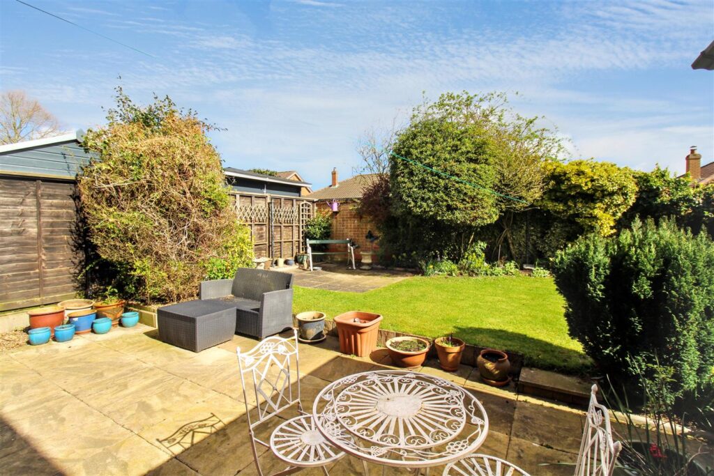 To the front the property is approached via the driveway with a small lawned area to the side and access to the single garage; which has an up and over door, power and lighting. The rear garden is enclosed and partly walled, with a variety of mature shrubs and flowers, lawn and a paved patio seating area.