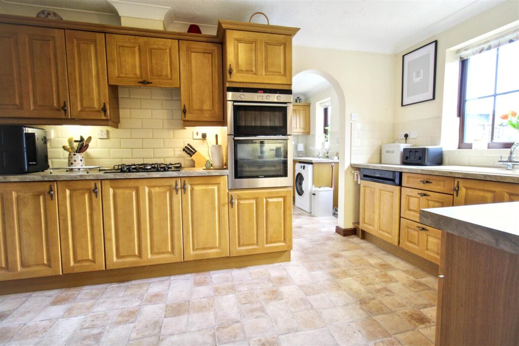 Double glazed window to rear aspect, fitted with a range of wooden fronted wall and base units with inset sink and drainer, four ring gas hob with cooker hood over, inset double electrivc oven, integrated dishwasher, built in storage cupboard, radiator, vinyl flooring.