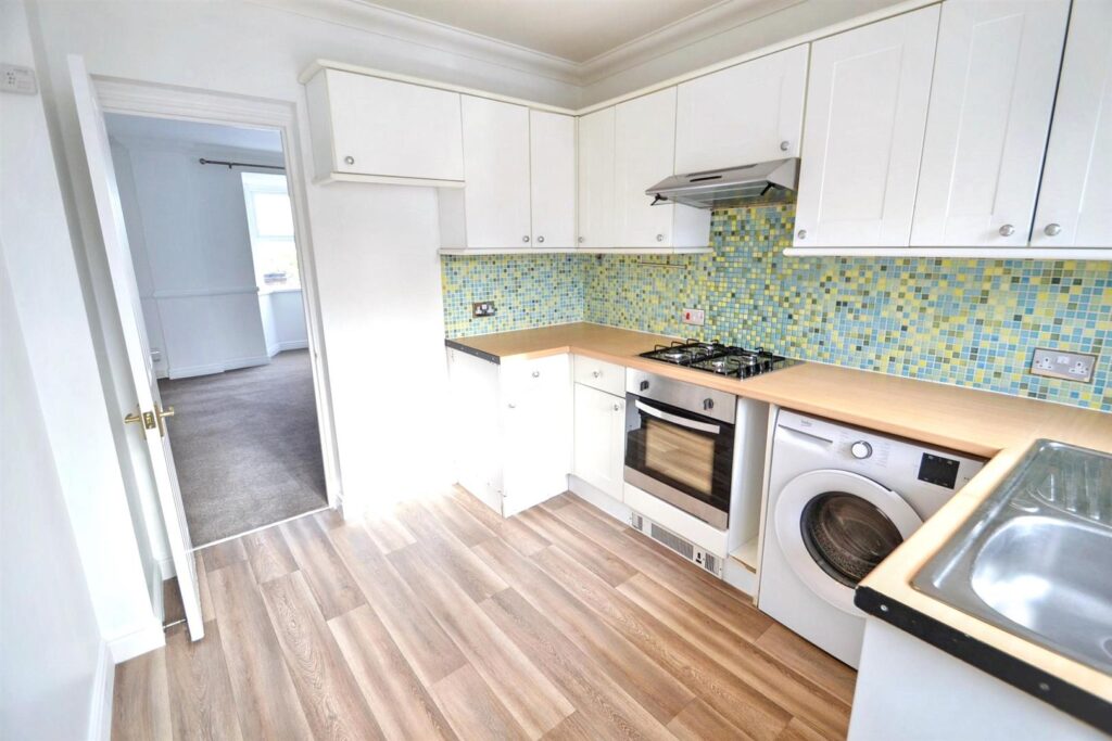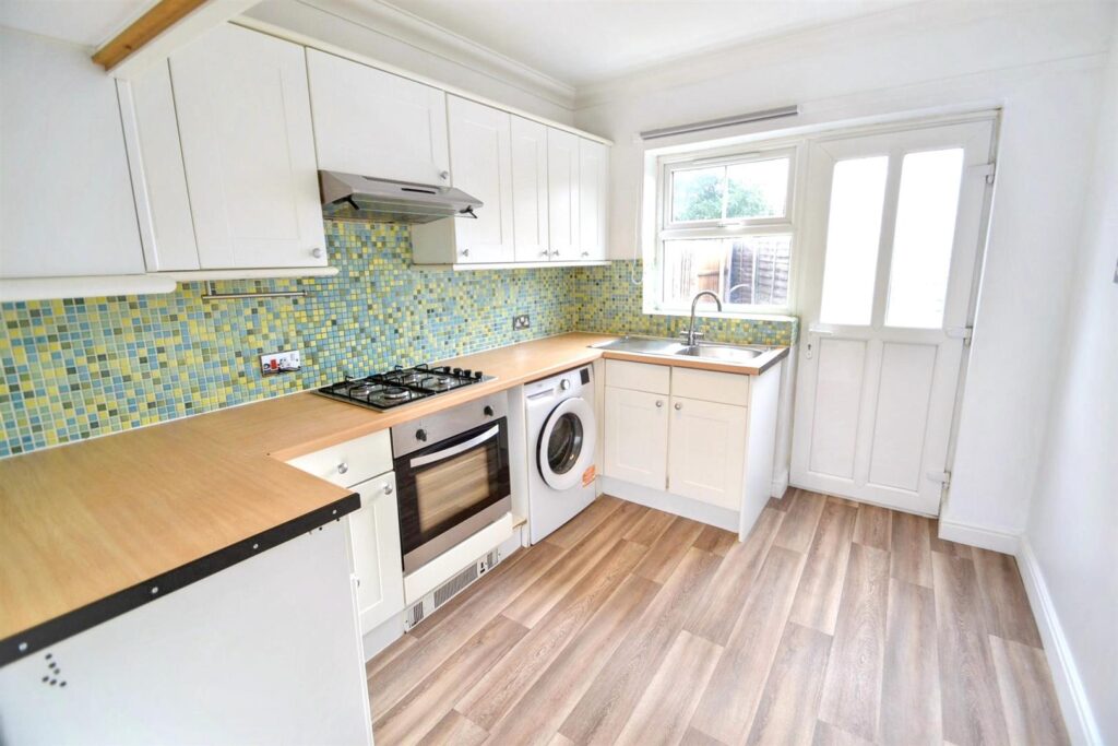 Fitted wall and base units with an electric single oven, gas hob and washing machine. UPVC double glazed window. Door to rear garden.
