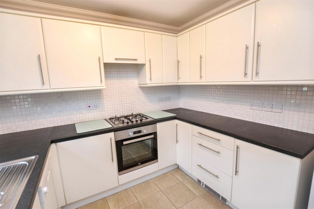 A good range of modern base and wall units with ample work surfaces. Inset sink units and inset hob and oven. Tiled floor.