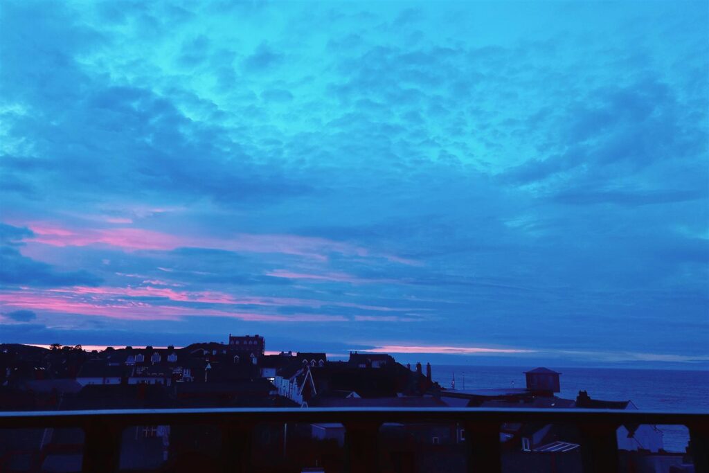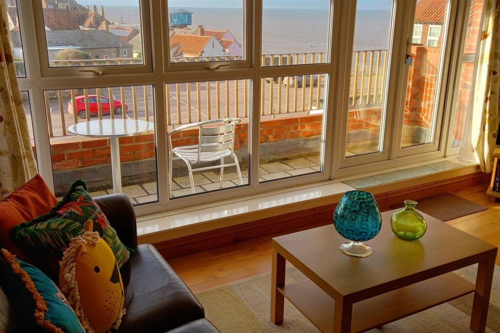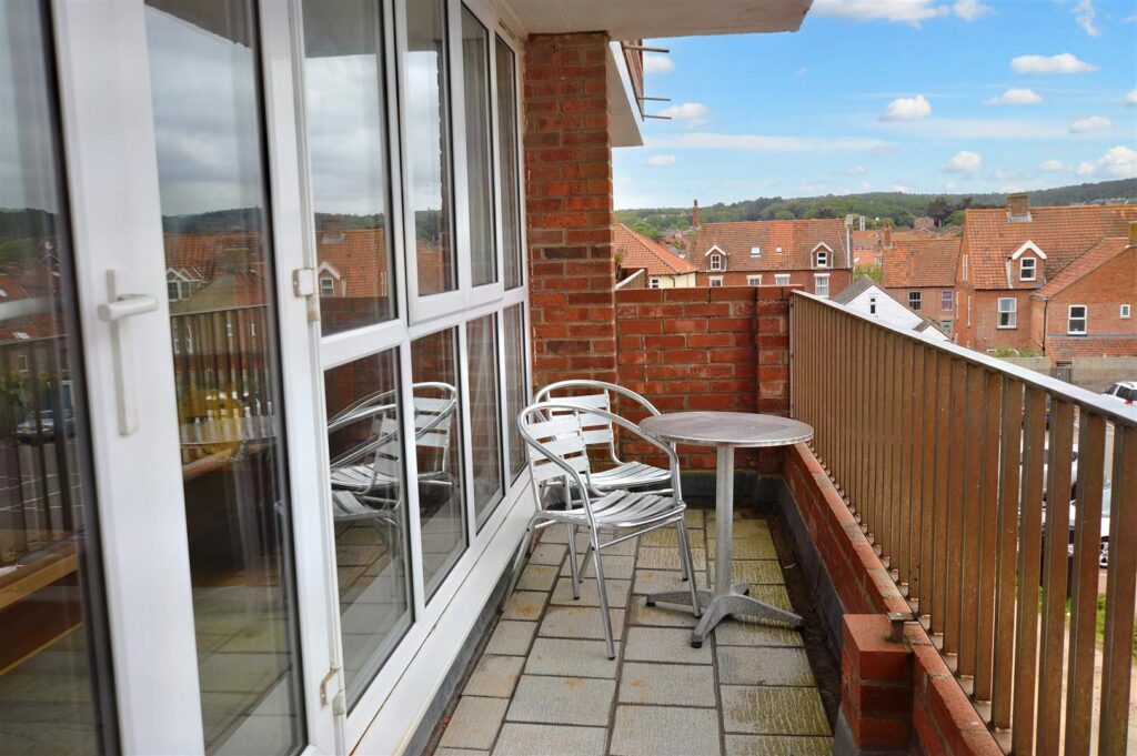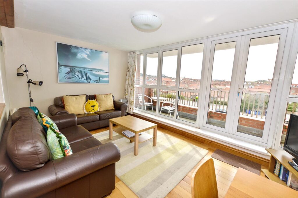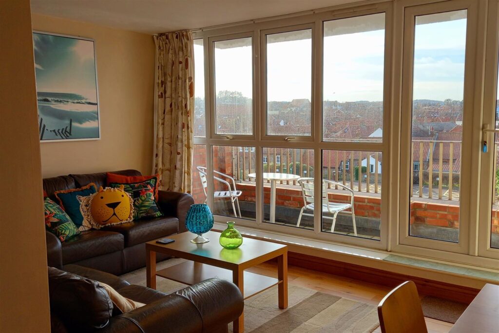 With part glazed door from hallway, wood flooring, TV aerial point, UPVC windows and doors opening to the balcony with space for alfresco dining and superb westerly views over the Town and sea.