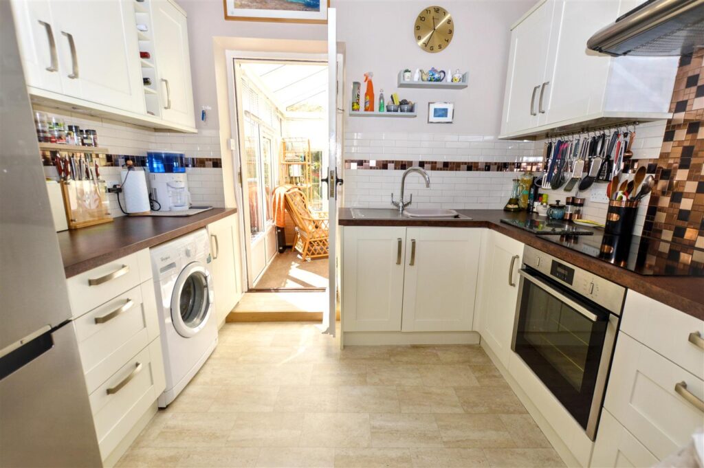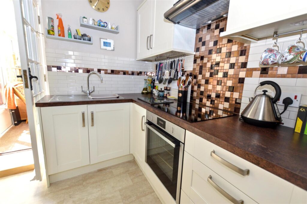 Fitted with a range of cream base, drawer and wall units. Dark wood work surface with inset electric hob and extractor fan above, built in electric cooker, inset single bowl sink unit with mixer tap over, provision for washing machine and fridge freezer. Vinyl flooring, ceiling light. Door to: