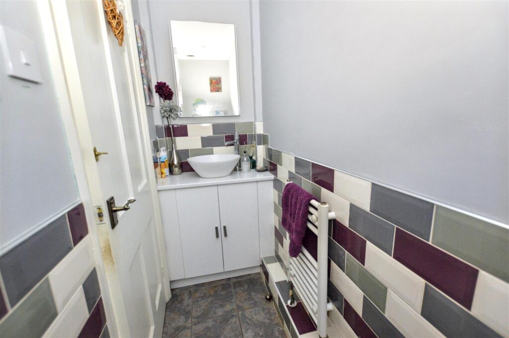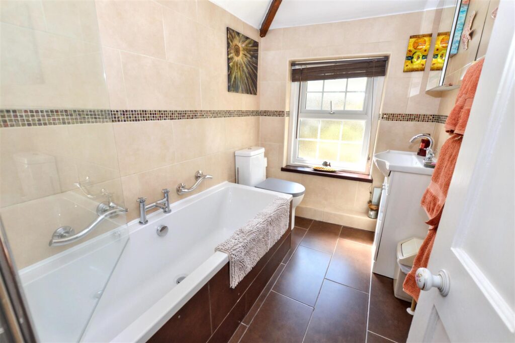 Double glazed sash style window to the side. White suite comprising of panelled bath with shower over, vanity wash hand basin and WC. Wall mounted heated towel rail.
