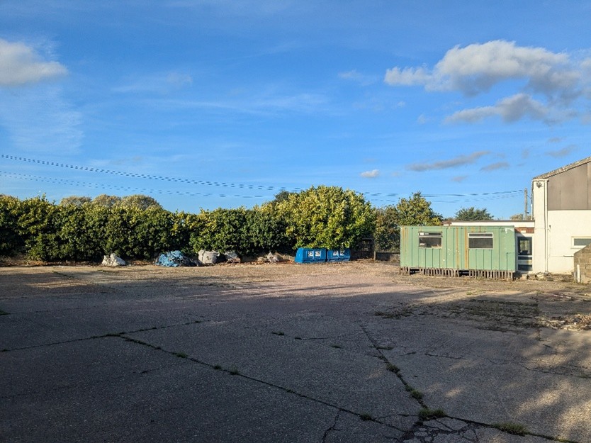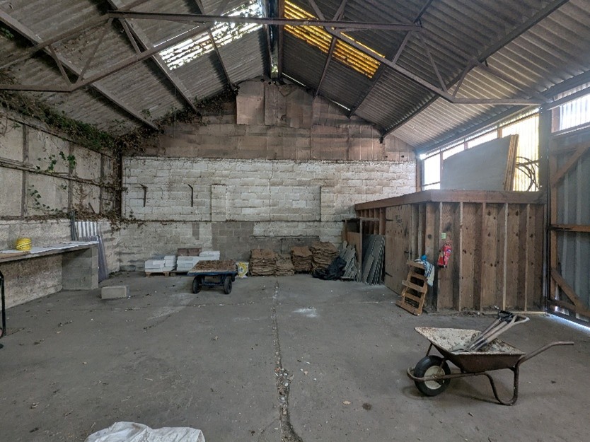The property comprises two elements. The first is a single-storey, steel-framed workshop with a mezzanine level beneath a pitched fibre cement roof, together with an adjoining concrete-surfaced storage yard.