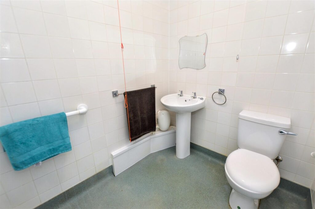 Pedestal wash basin, close coupled w.c., electric shower unit, fully tiled walls, extractor fan.