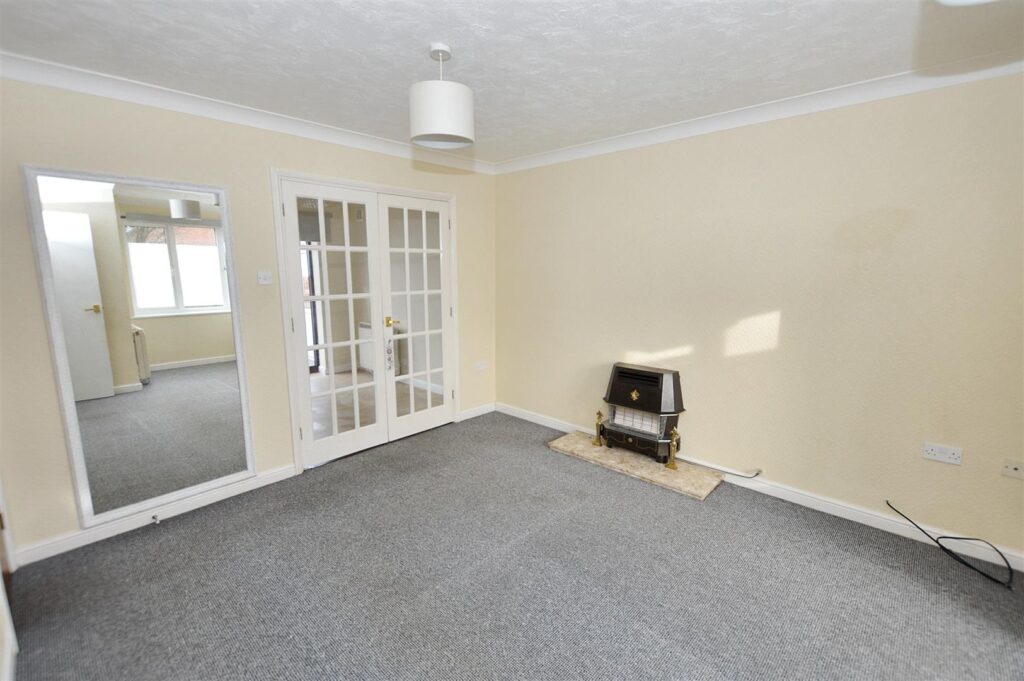 UPVC bay window to the front aspect, night storage heater, gas fire on marble plinth, provision for TV, large understairs storage cupboard, glass panelled doors opening to: