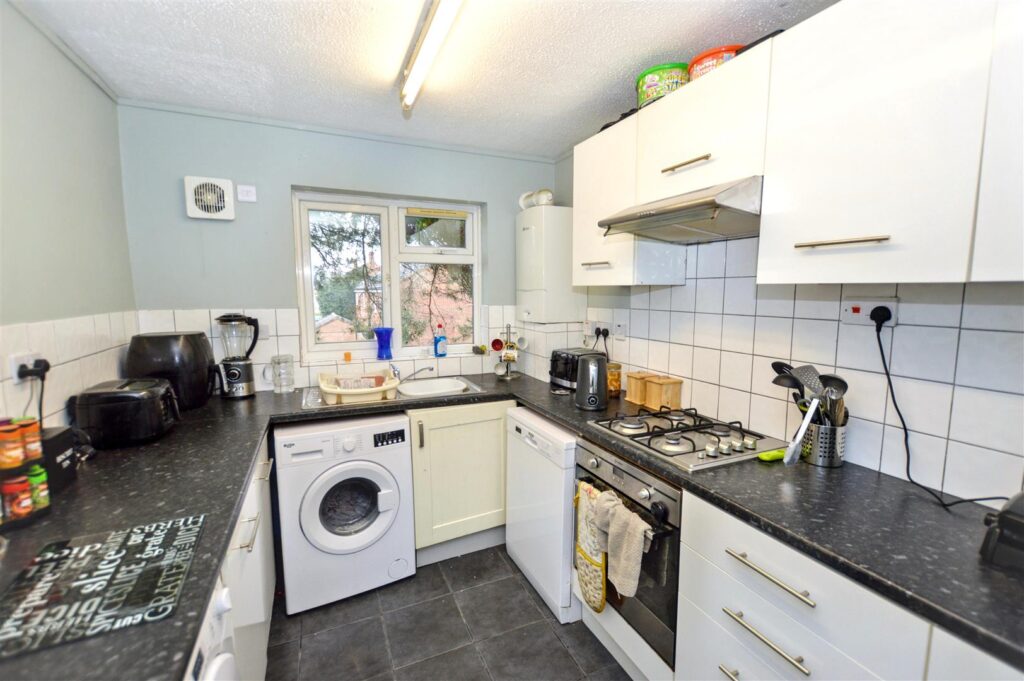 A comprehensive range of high gloss white base and wall cabinets, laminated work surfaces and tiled splashbacks, window to front aspect, wall mounted gas fired boiler providing central heating and domestic hot water, inset four ring gas hob with filter hood above and electric oven beneath, provision for washing machine, dishwasher and tumble dryer, glass panelled door to hallway.