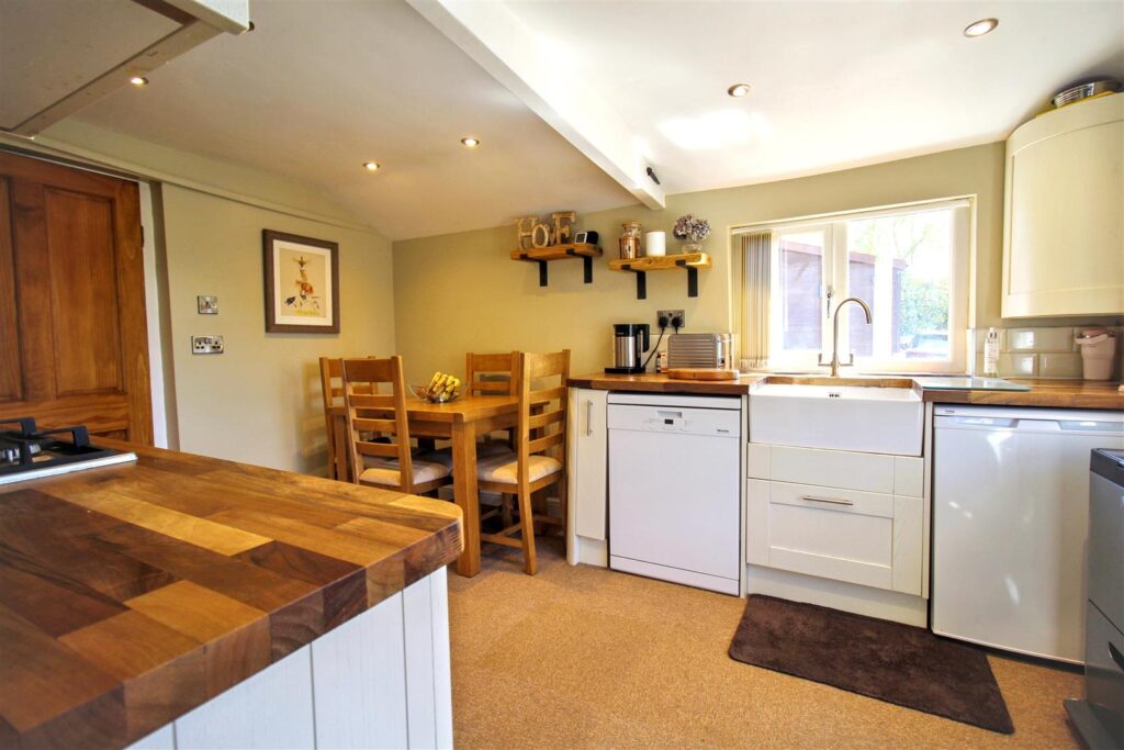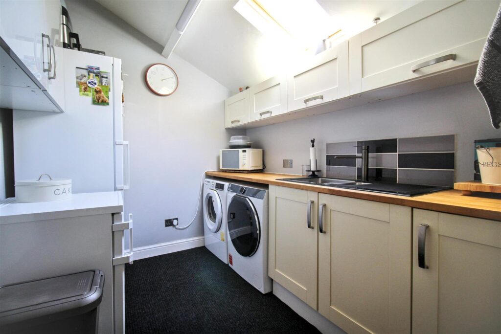 Double glazed Velux window to rear aspect, wall and base units with timber worksurface over, inset one and a half sink and drainer, space and plumbing for washing machine and tumble dryer, space for free standing fridge/freezer, carpet, radiator.