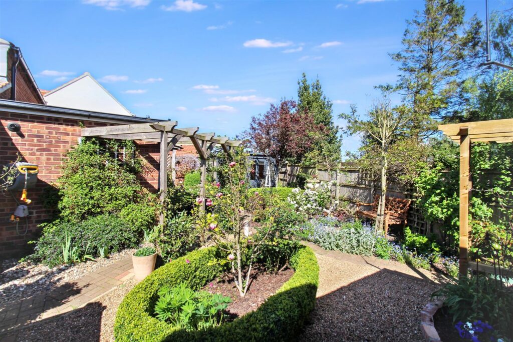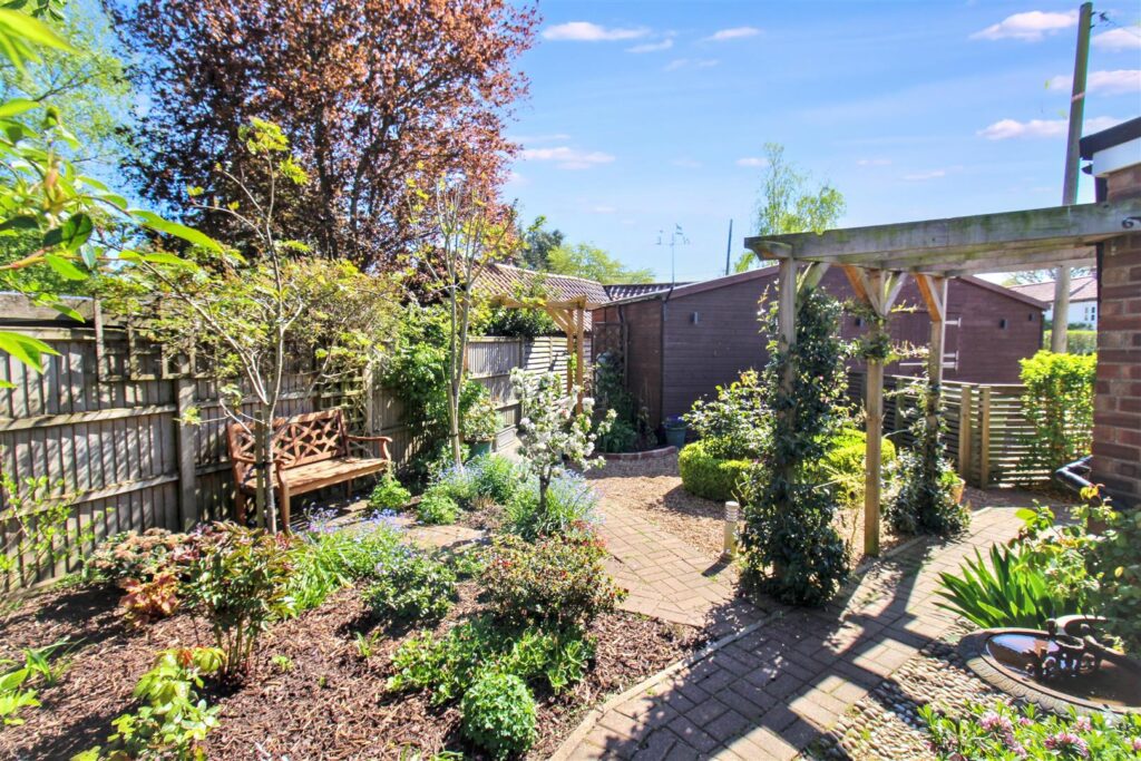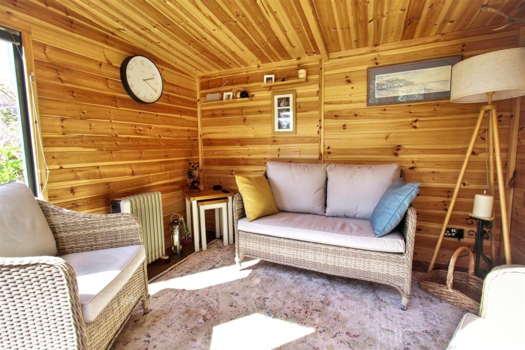 To the front the property features a shingle driveway with space for two vehicles and access to the double garage which has timber fronted double doors, power, lighting and is boarded for further storage. A low lying gate leads to the garden which wraps around the side and rear of the property. The garden boasts borders of a variety of established shrubs and flowers with a paved pathway leading through and a summer house which has power and lighting.