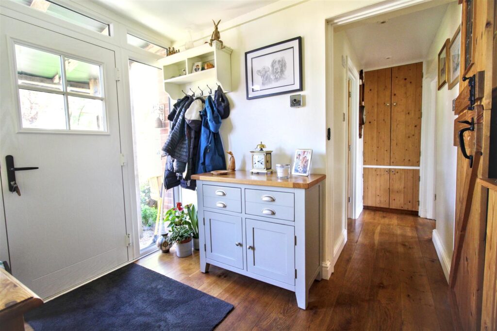 Composite door to rear entrance with windows to either side, solid oak flooring, radiator, airing cupboard.