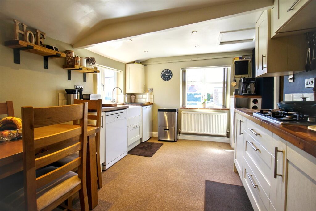 A dual aspect room with double glazed window to side and front aspect, fitted with a range of wall and base units with four ring gas hob and cooker hood over, inset ceramic butlers sink, space and plumbing for dishwasher, radiator, carpet, loft access.