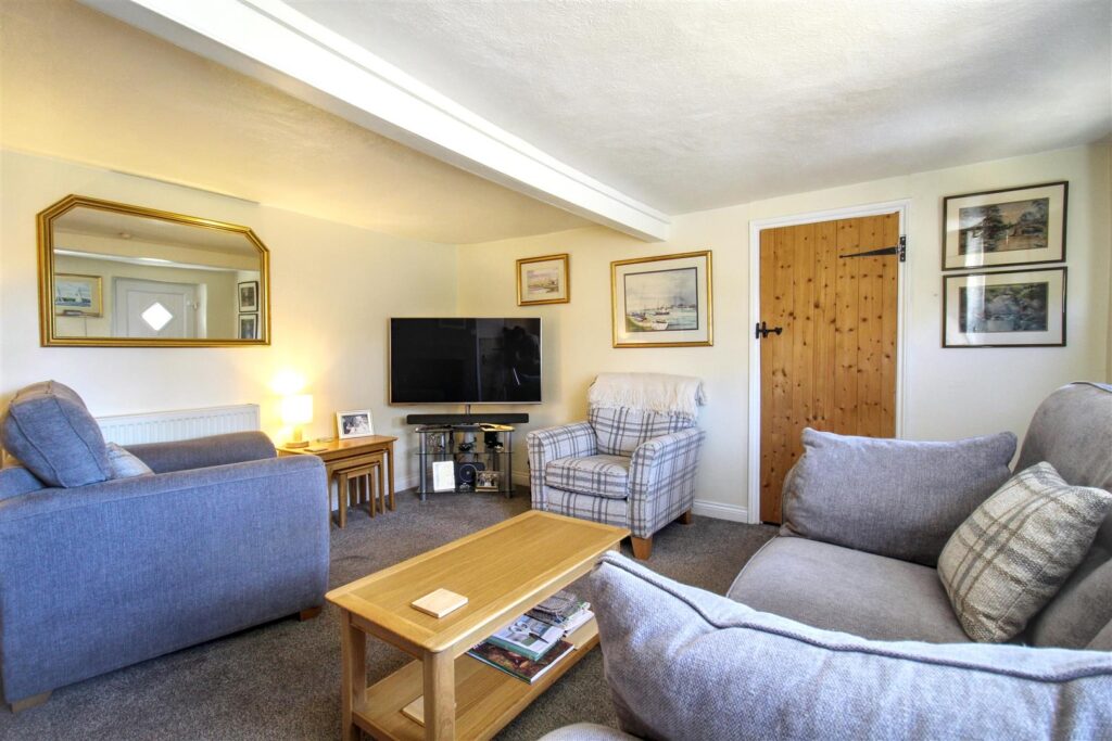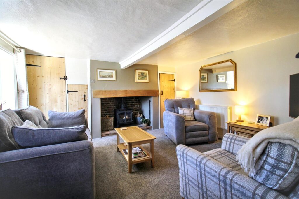 Double glazed window to front aspect, inglenook fireplace with wood burning stove, built in storage cupboard, carpet, radiator, composite door to front entrance, stairs to first floor.