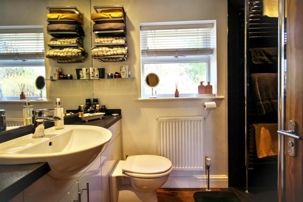 Double glazed window to rear aspect, fitted with a walk in double shower with mains connected shower, vanity unit fitted with WC and wash hand basin, radiator, solid oak flooring, heated towel rail, extractor fan.