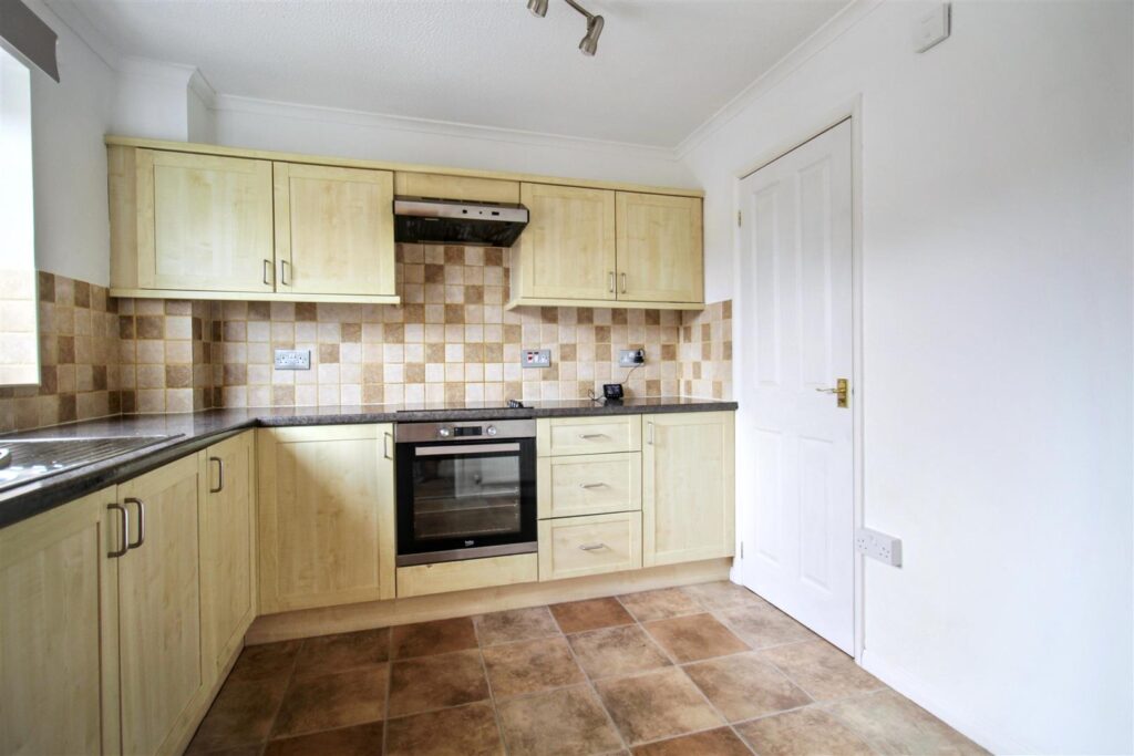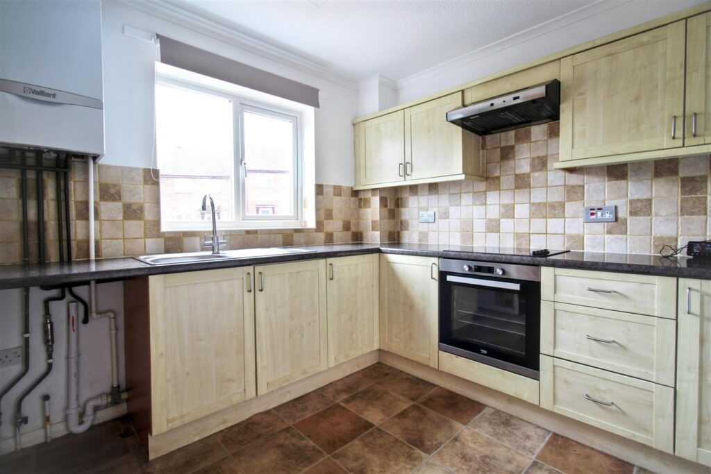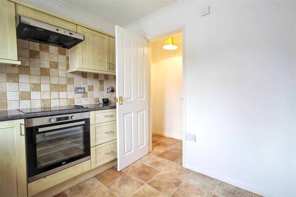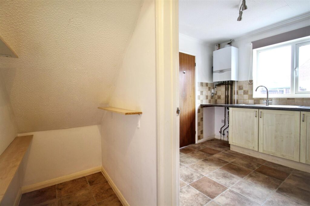 Range of contemporary fitted units with roll edge worktops, stainless steel sink, integral Beco oven and electric hob with extractor, radiator and space and plumbing for washing machine. Valliant gas fired boiler. Double glazed window to front aspect, with fitted blind. Access to under stairs storage can serve as a pantry or additional storage..