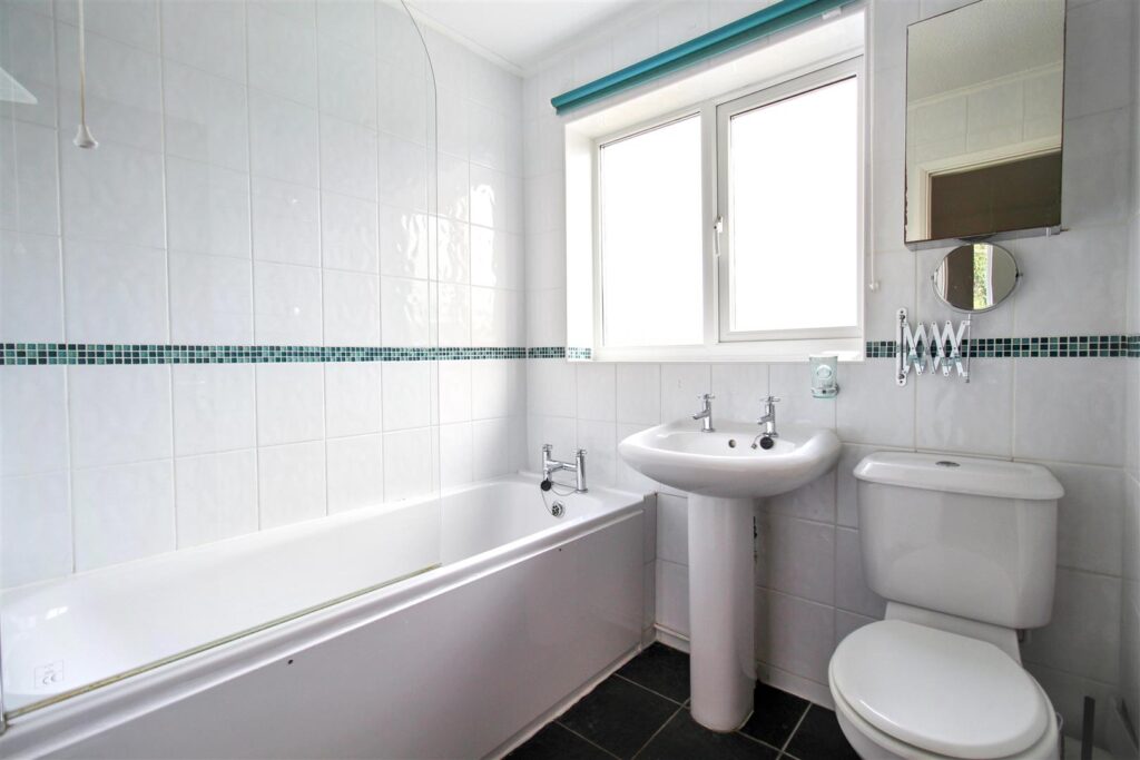 Bath with electric shower over & shower screen, wash basin and WC. Towel rail / radiator. Window to front aspect & tiles on the floor.