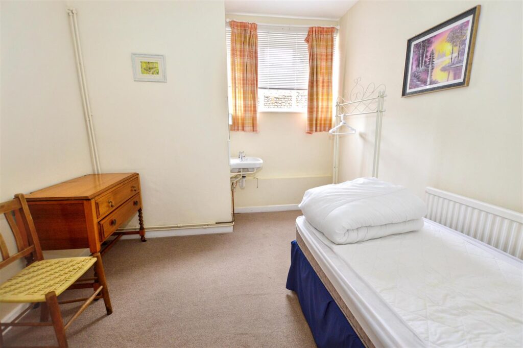 Window to rear, carpet, ceiling light, radiator, pedestal wash hand basin.