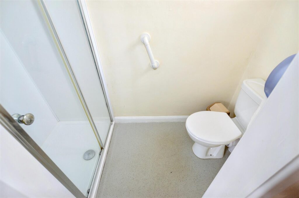 Shower cubicle with glazed door, wash hand basin, WC, vinyl flooring, window to the rear, radiator.