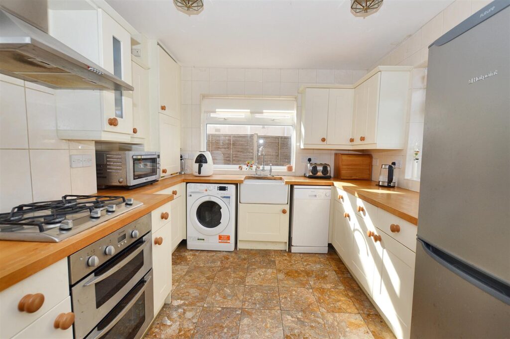 Another lovely light room with patio doors and window to rear aspect and another window to the side. Two radiators, comprehensive range of shaker style base and wall units with wood work surfaces and tiled splashbacks. Belfast sink, washing machine/dryer and dishwasher (included in sale), inset gas hob with double oven beneath and filter hood above.