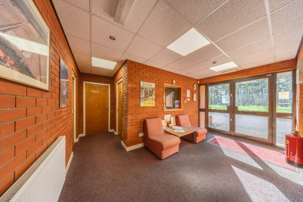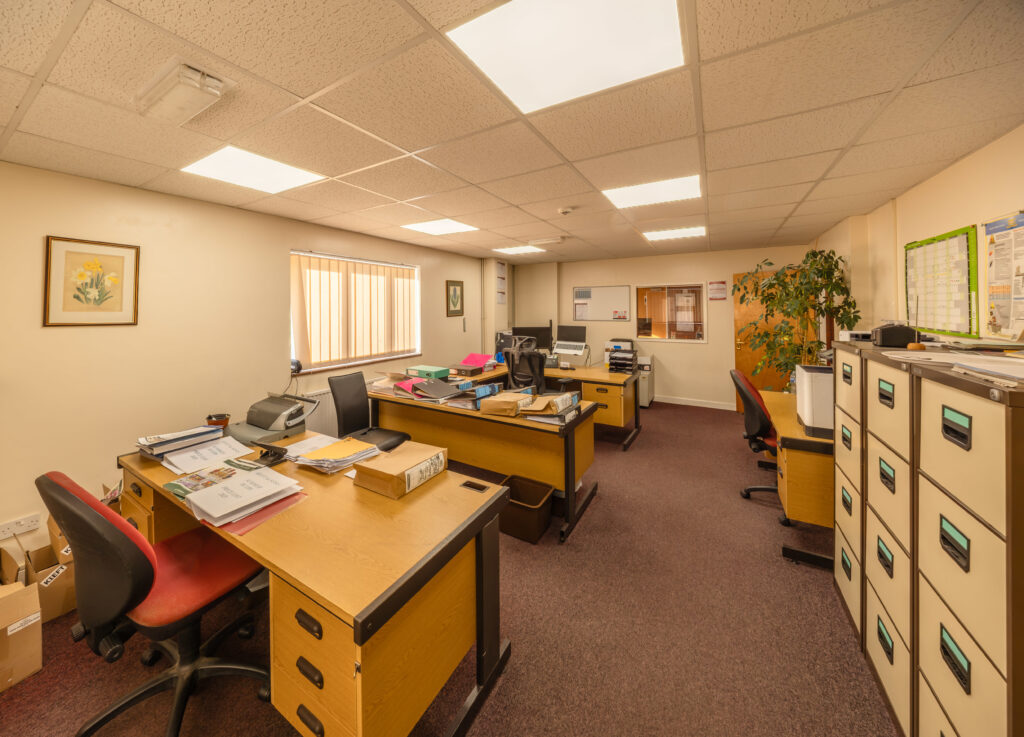 Adjacent to the road is a single storey office module with offices and reception area, generally with tiled floors, plastered emulsion wall finishes, strip lighting and spot lighting in the reception area.