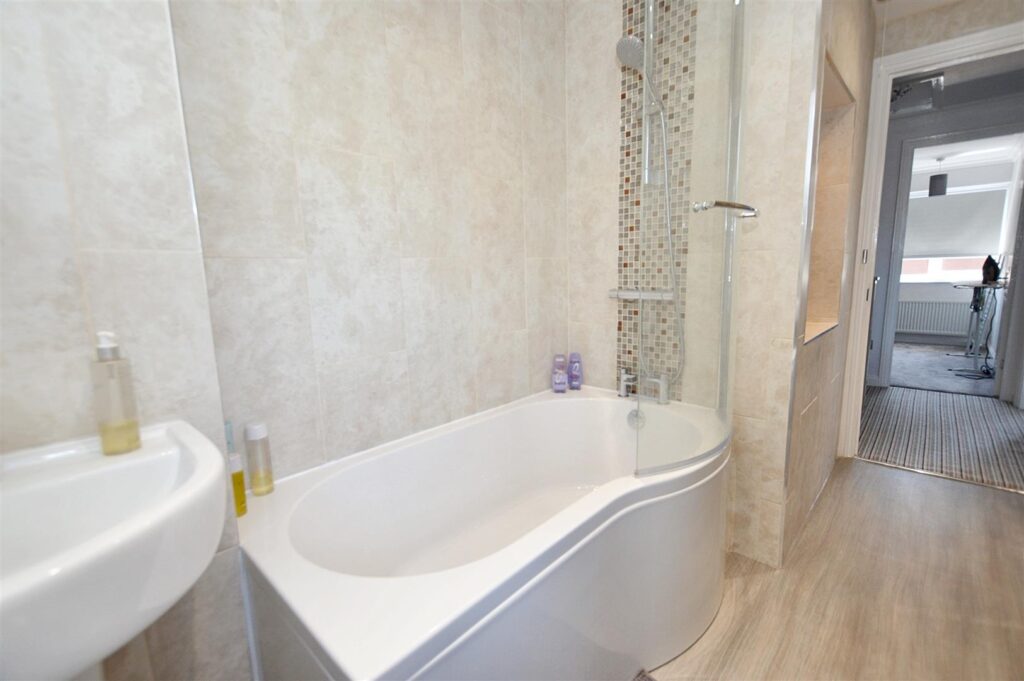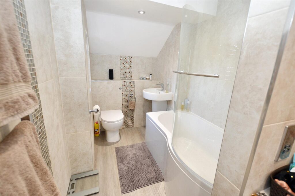 Recently refitted with a modern three piece suite of panelled bath with glazed screen and mixer tap with shower. Wall hung wash basin, concealed cistern w.c., tiled recess, chrome heated towel rail, fully tiled walls.