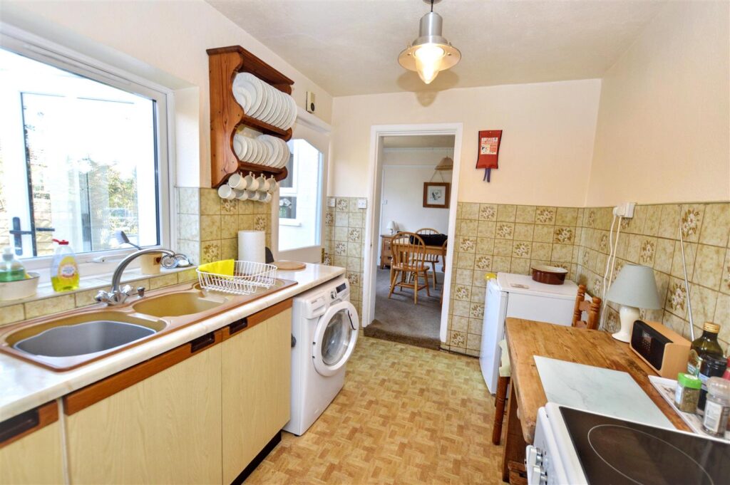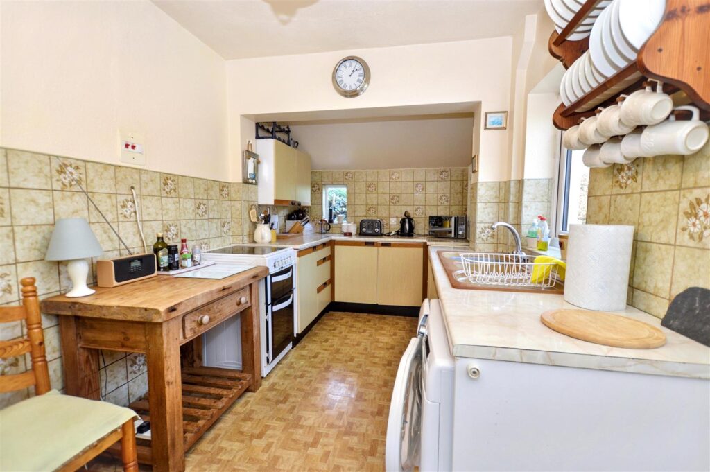 A comprehensive range of base and wall cabinets with laminated work surfaces and tiled splashbacks. Wall mounted gas boiler providing domestic hot water, inset double bowl sink unit, provision for washing machine, window to front aspect, point for electric cooker. Opening to: