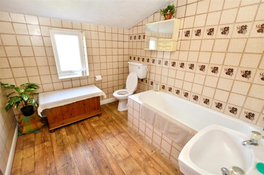 Panelled bath, pedestal wash basin, low level w.c., window to front aspect, electric heated towel rail, tiled walls.