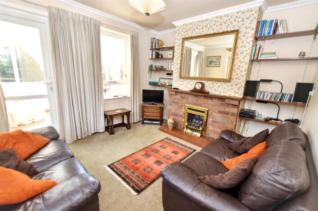 Feature brick fireplace with fitted gas fire, fitted alcove shelving, provision for TV, window to side aspect, glass panelled door and window to: