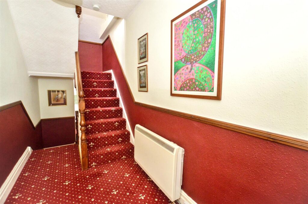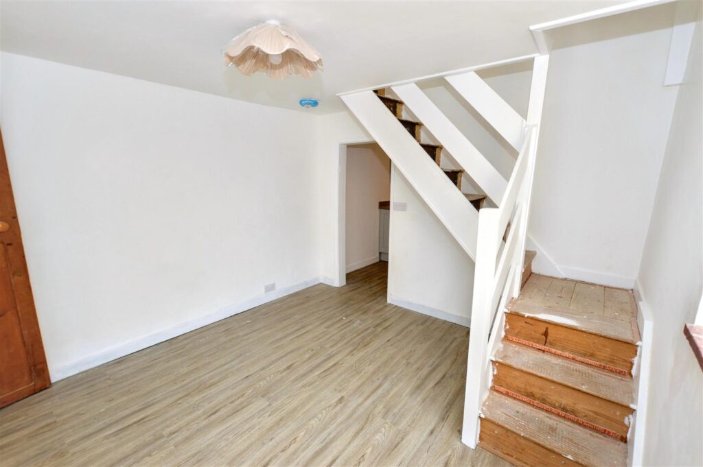 Original tiled floor, stairs to first floor with understairs storage cupboard, original archway.
