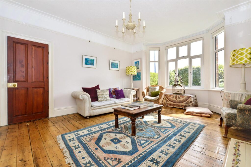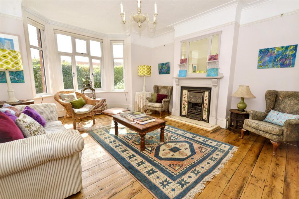 A beautifully light room with wide bay window to front aspect, feature period style fireplace with tiled hearth and inserts, point for gas fire, polished pine flooring.