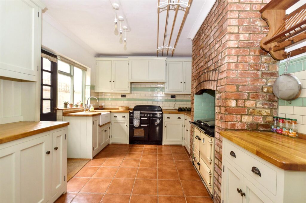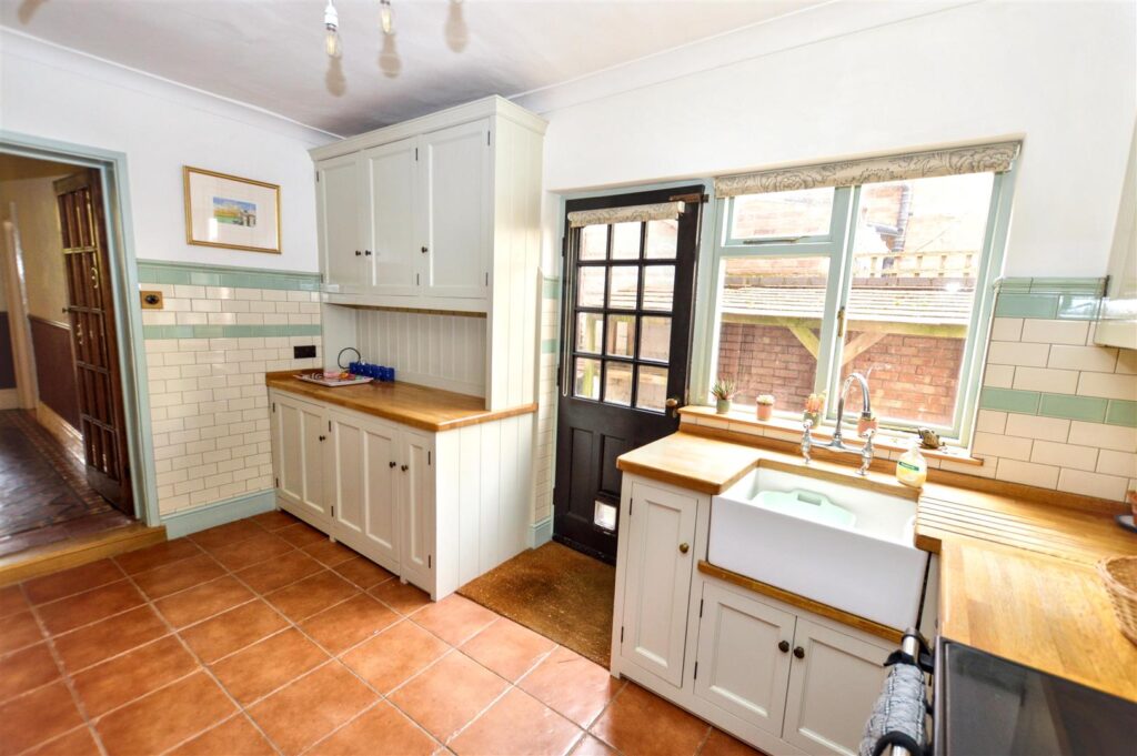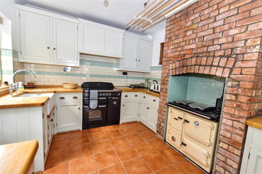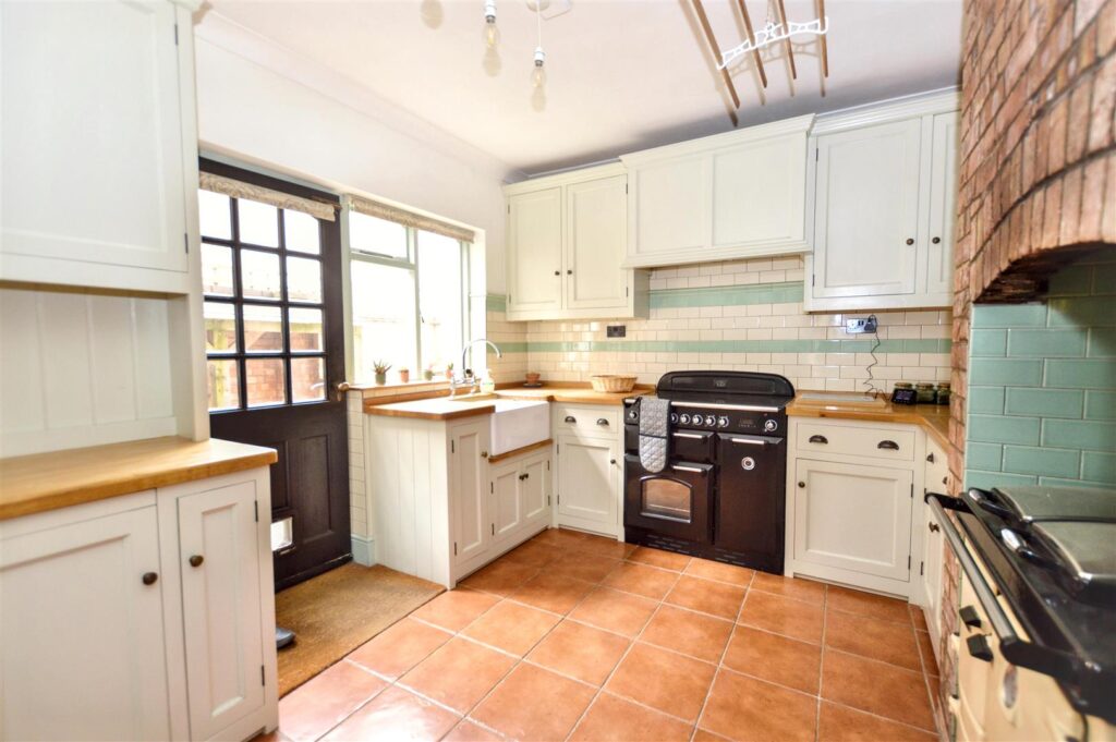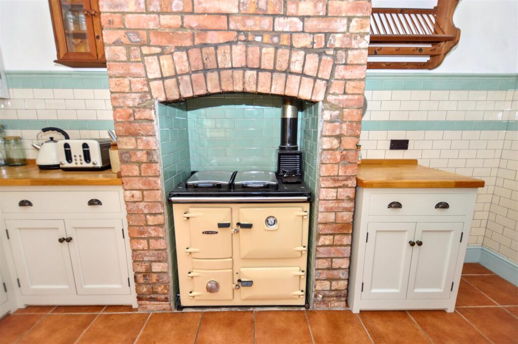 Fitted with a comprehensive range of bespoke base and wall cabinets with solid wood work surfaces and part tiled walls, matching dresser unit, inset Belfast sink with chrome mixer tap, range style electric stove with double oven, glass panelled door and window to rear courtyard, tiled floor, exposed brick chimney fitted with solid fuel Rayburn stove. Tiled floor.