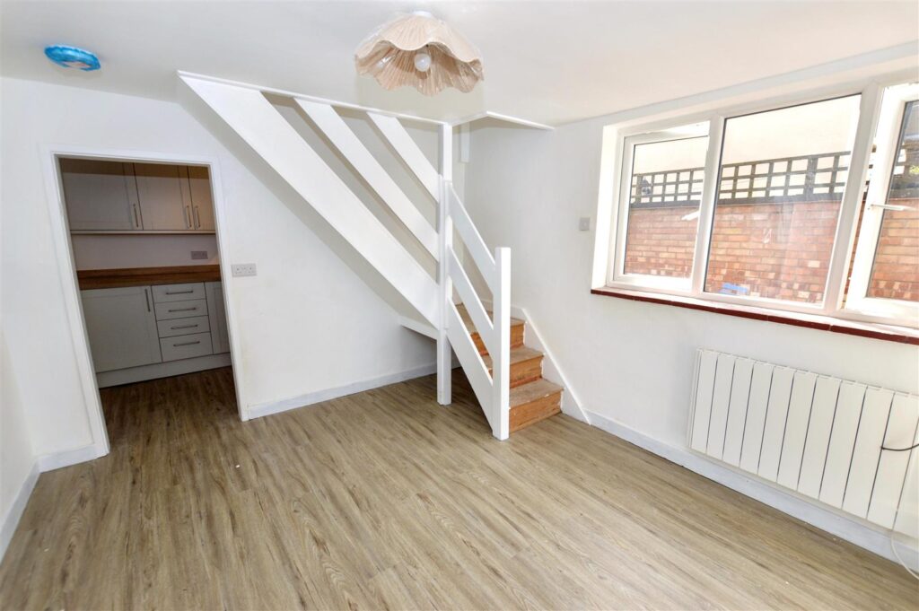 Wall mounted electric heater, window to side, stairs to first floor. Door to: