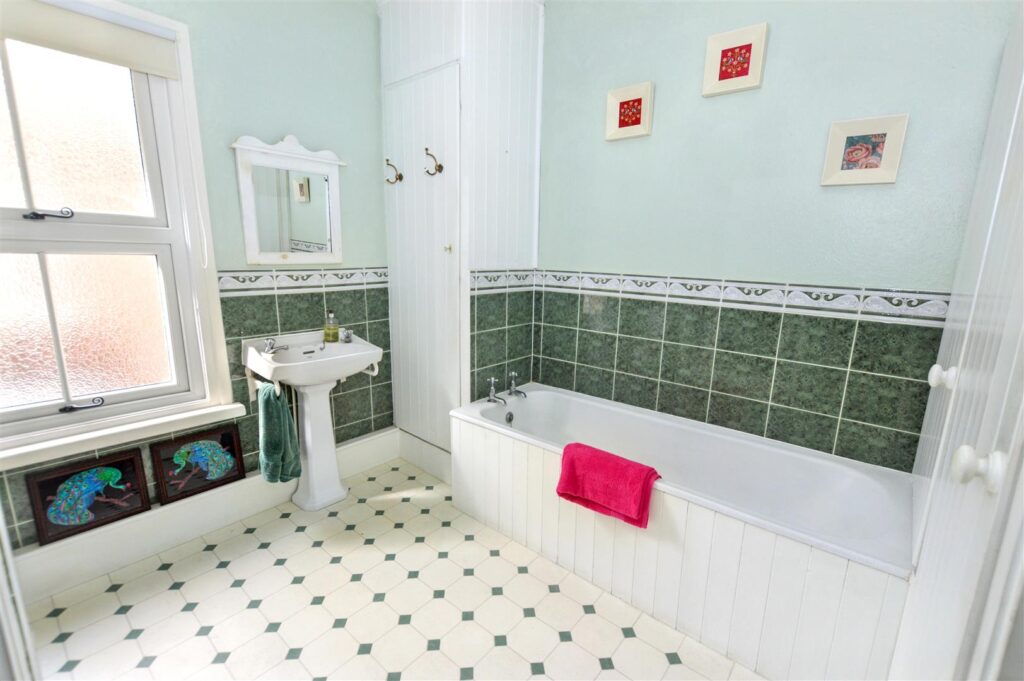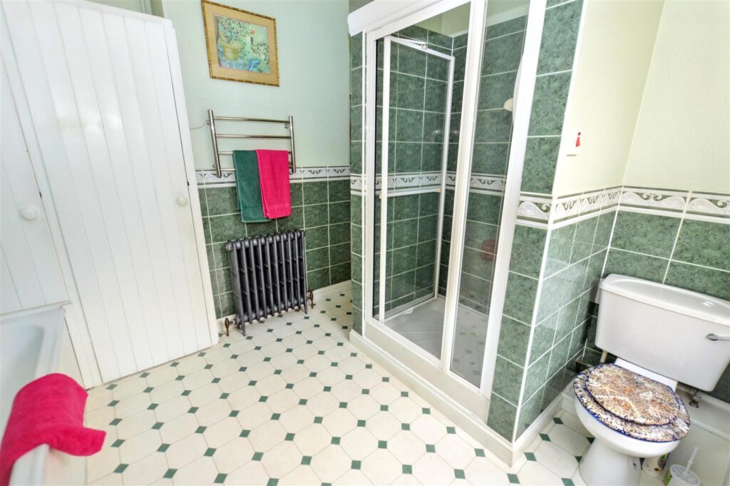 Panelled bath, pedestal wash basin, close coupled w.c., fully tiled shower enclosure with electric shower unit, radiator, part tiled walls, fitted store cupboards including airing cupboard.