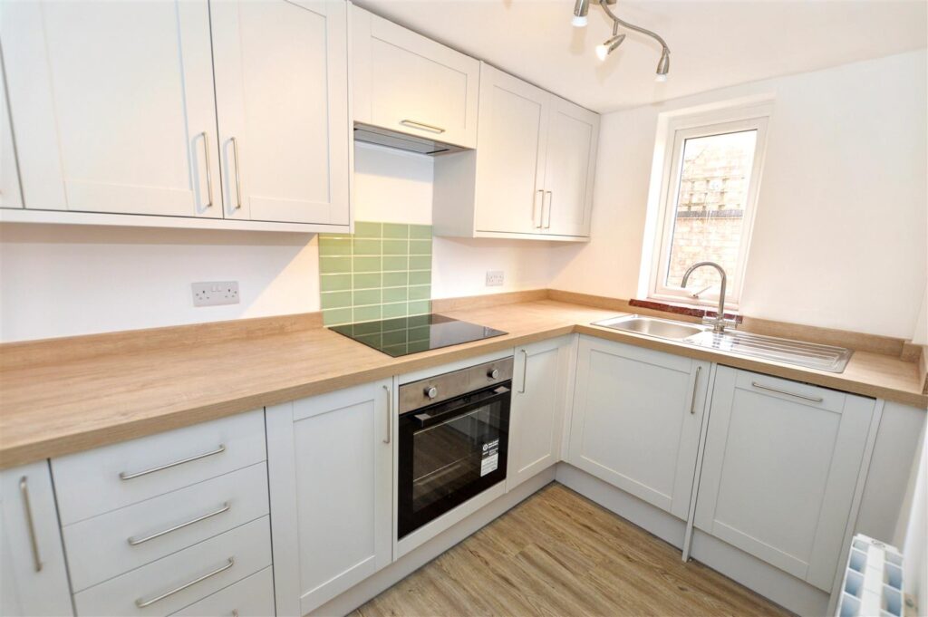 Recently re-fitted with a modern range of base and wall cabinets with wood-effect work surfaces and matching upstands. Integrated refrigerator and dishwasher, inset electric hob with integral oven beneath, inset sink unit, window to side aspect, wall mounted electric heater.