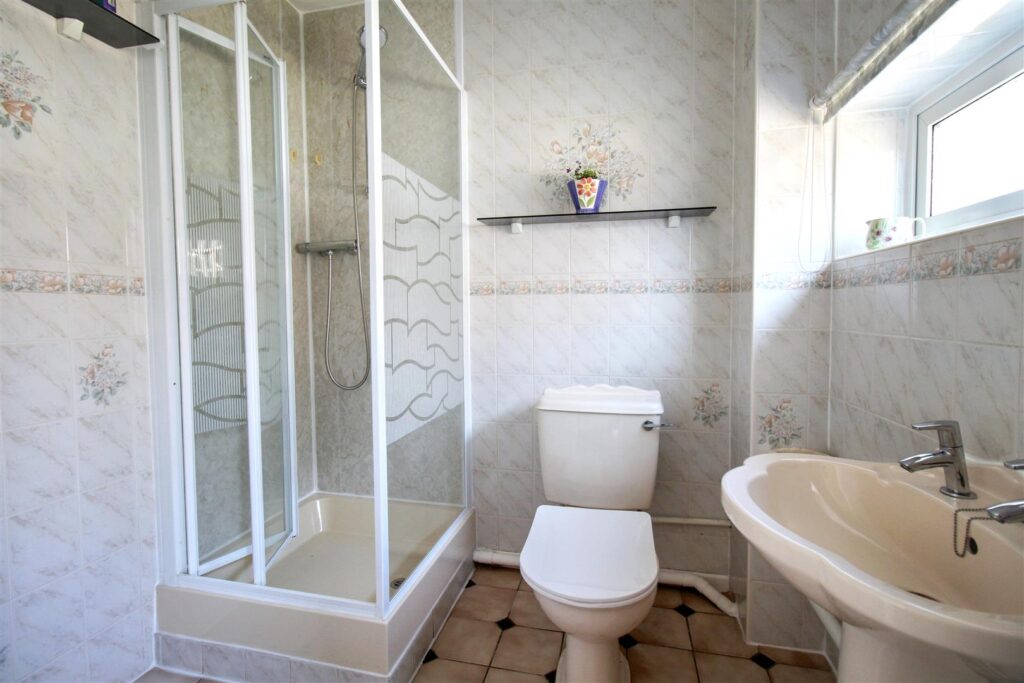 Double glazed window with obscured glass to side aspect, shower cubicle with mains connected shower over, WC, pedestal wash hand basin, extractor fan, tiled floor and walls.