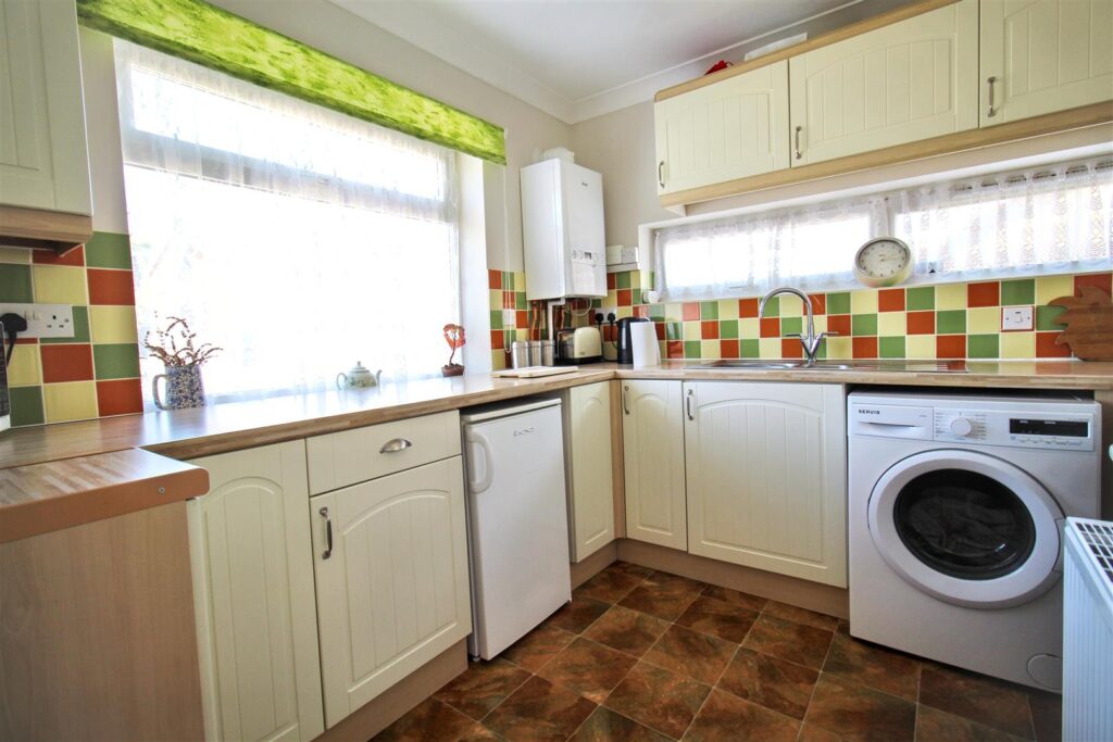 Dual aspect room with double glazed window to front and side aspect, wall and base units with inset one and a half sink and drainer, space and plumbing for washing machine, under counter fridge, radiator, gas oven with four ring hob, wall mounted gas boiler replaced in 2022, built in storage cupboard, vinyl flooring.