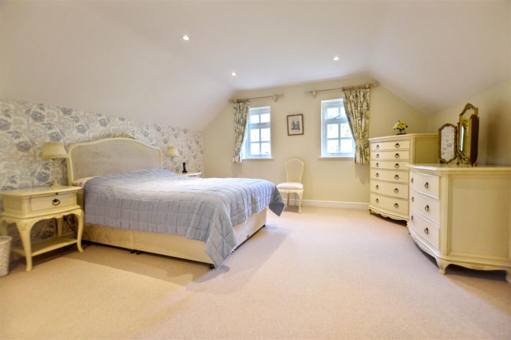 The property is approached over a shared access leading to the gated, shingled driveway providing off-road parking for a number of vehicles. Access either side of the property leads to the large rear garden which is fully enclosed with mature shrubs and trees and backs onto open farmland. There is a large paved patio area leading to the extensive lawns and established borders.