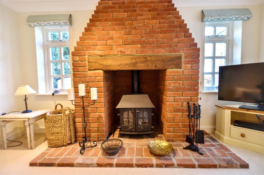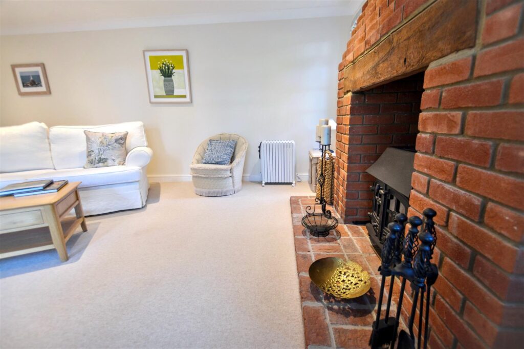 A beautifully proportioned room with central, full-height brick fireplace housing wood burning stove on tiled hearth, provision for TV, three windows overlooking the rear garden. Twin glass panelled doors to: