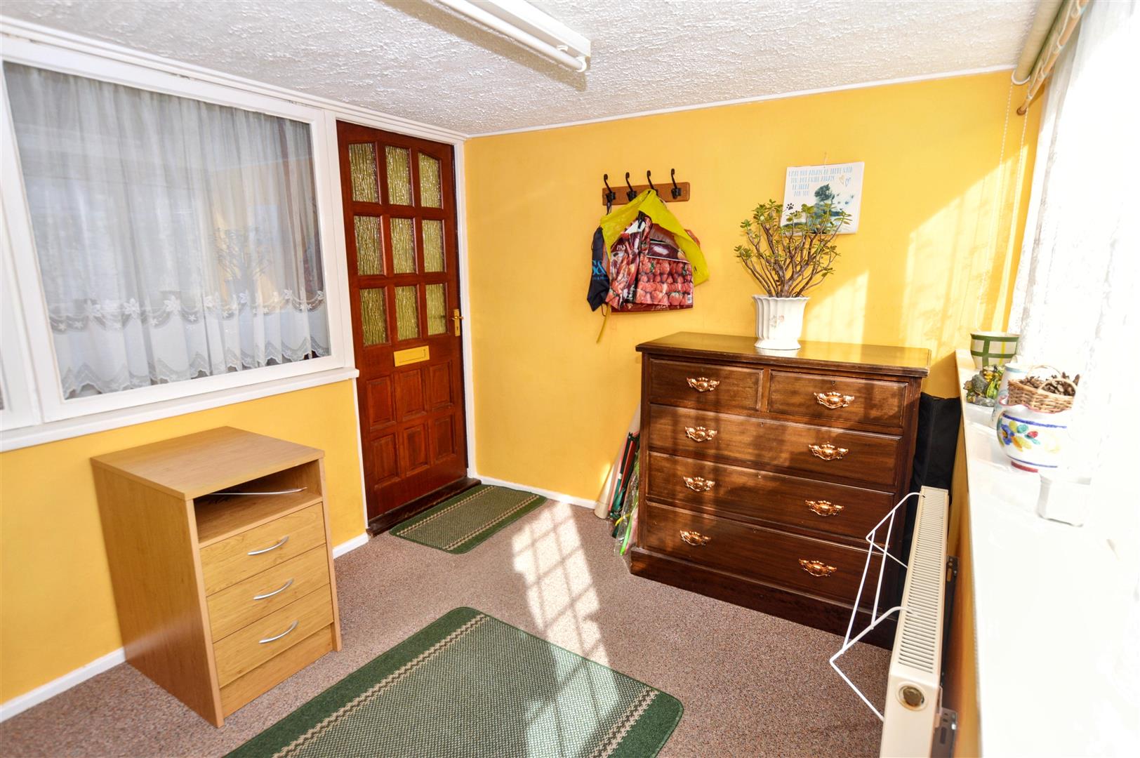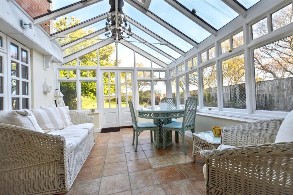Vaulted glass roof, twin doors to rear garden, tiled floor. Glass panelled doors to: