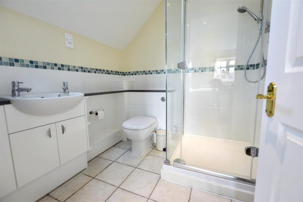 Corner shower enclosure with mixer shower unit, concealed cistern w.c., vanity wash basin with cupboards beneath, chrome heated towel rail, wall mirror, tiled floor, Velux roof light.