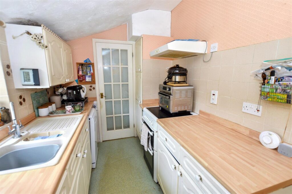 A range of base and wall storage cupboards with laminated work surfaces and tiled splashbacks. Inset sink unit, provision for dishwasher and space for under counter fridge. Point for electric cooker with filter hood above, window to side aspect. Full length glass door to:
