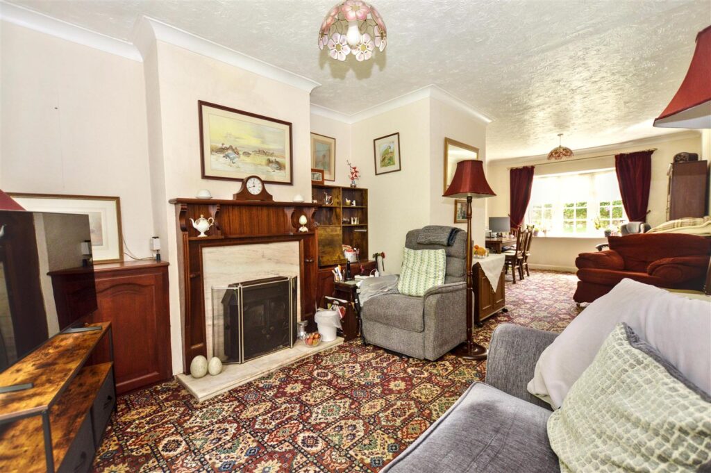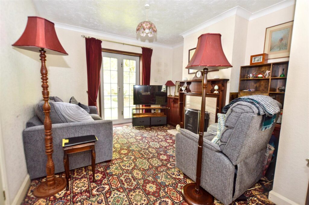 Feature timber and marble effect fire surround currently housing a solid fuel stove (not operational). Alcove storage cupboards, provision for TV, French doors to rear garden, glass panelled door to: