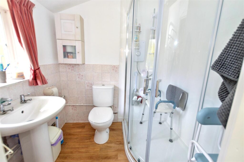 Corner shower enclosure with independent electric shower, close coupled w.c., pedestal wash basin, radiator, window to side aspect. Part tiled walls, provision for washing machine.