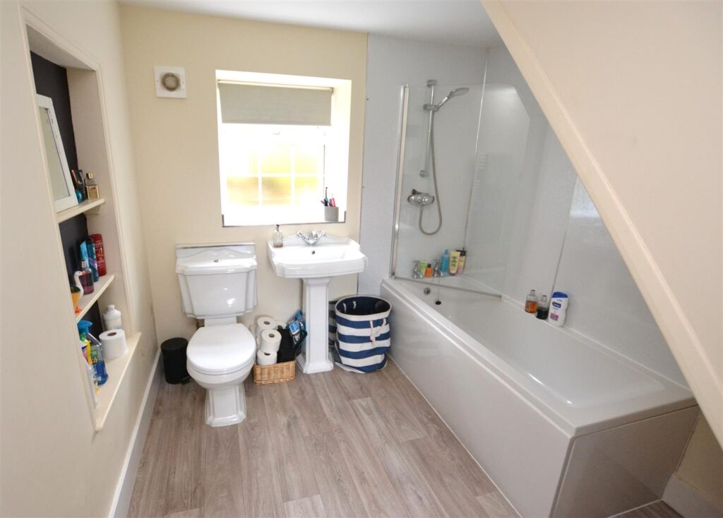 Bath with shower over, wash basin and WC. Towel rail / radiator.
