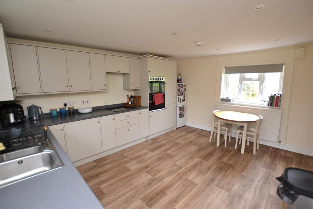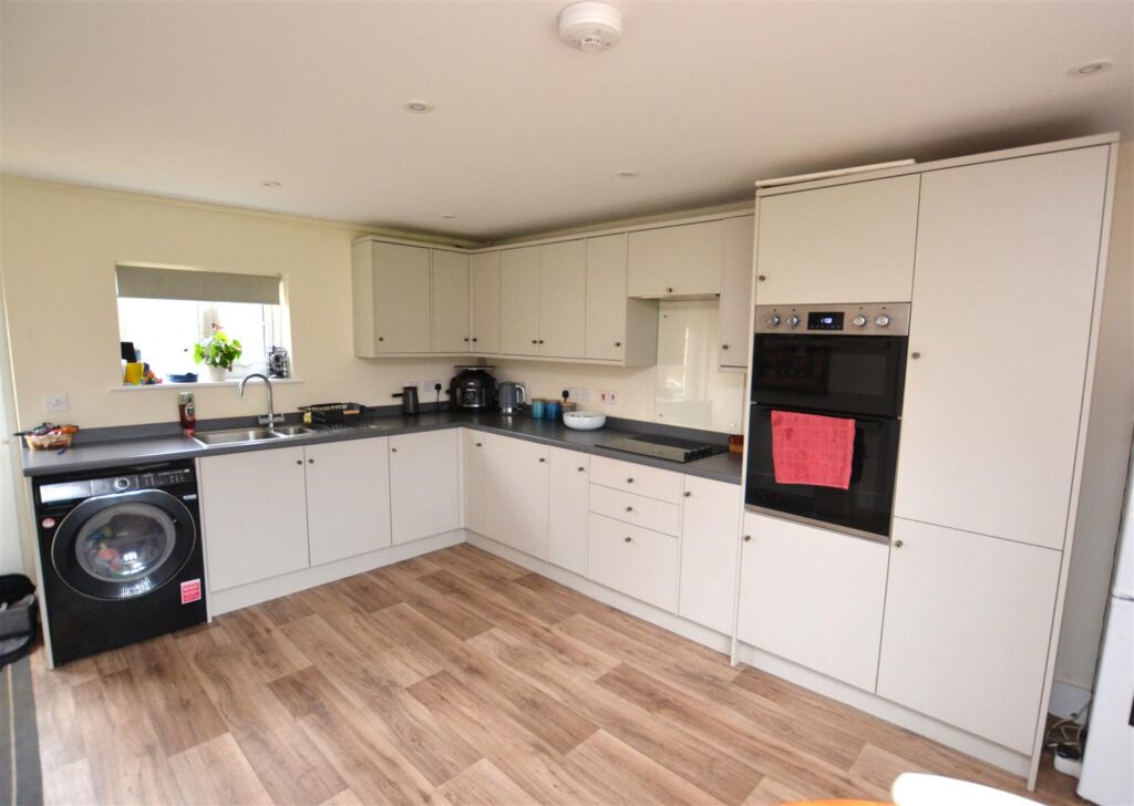 A spacious double aspect room with a good range of base and wall units, ample work surfaces, inset sink, inset hob and double oven. Space and plumbing for washing machine. Radiator and 2 double glazed windows. Door to rear.