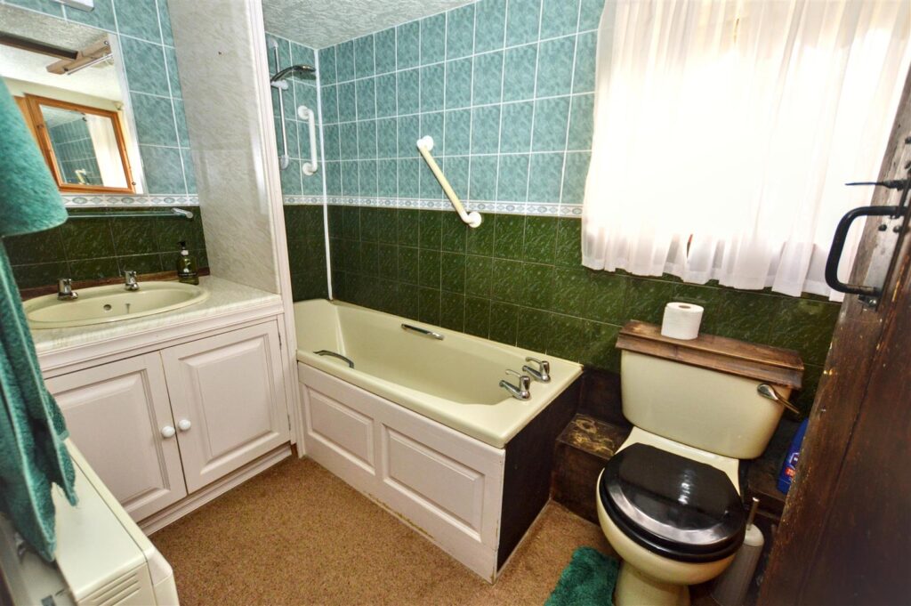 Double glazed window to the side. Bath with shower over, WC, and wash basin, electric wall mounted heater, tiled walls and ceiling light.