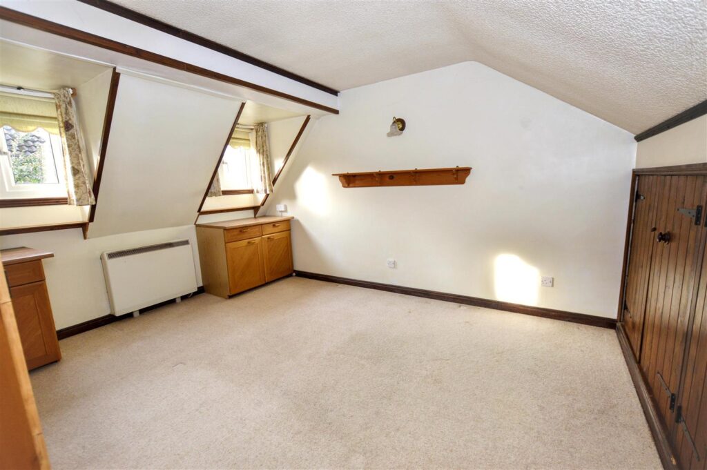 Two double glazed windows to the rear, wall mounted electric heater, door to under eaves storage area and built in pine double wardrobe.